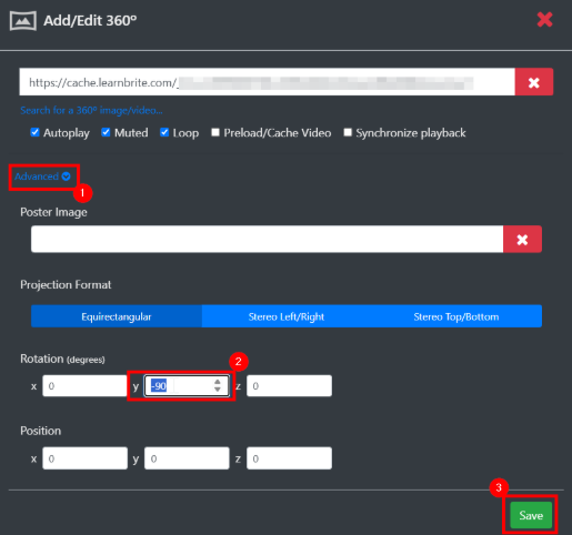 Change the starting viewpoint of the 360 by adjusting the Advanced settings Y Rotation to a value between 0 and 360 degrees.