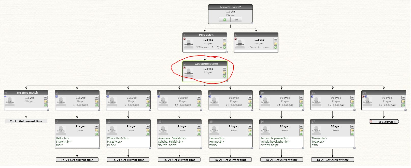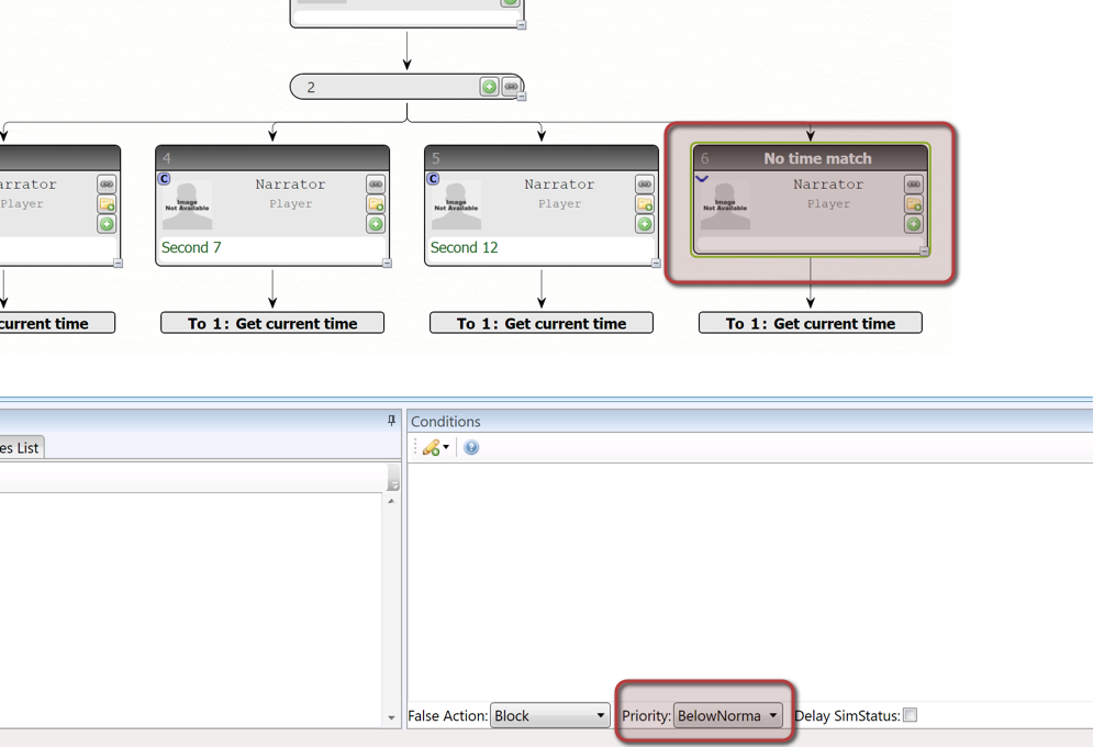 Additionally, a “catch-all” node is inserted, so that whenever the time does not match a condition the conversation goes back to checking the video’s time. This is an empty node, with no condition but Priority set to “BelowNormal”
