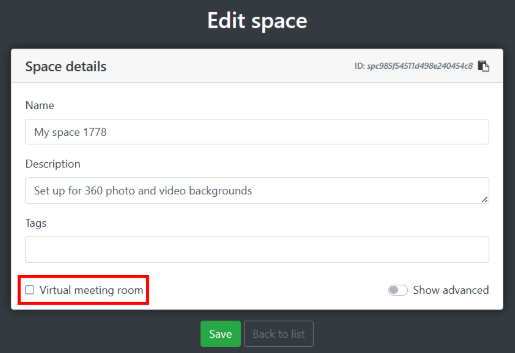 By default the 360 template is setup for multiuser experiences. The Virtual meeting room setting is on by default in the dashboard settings for the 360 space.
