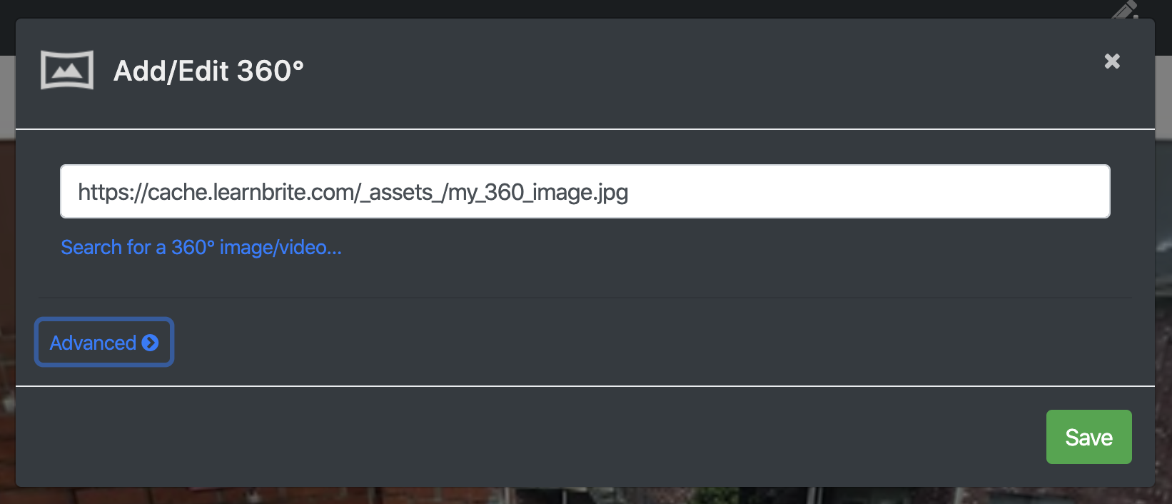 Have a web link (URL) to a 360 image (.jpg) or 360 video (.mp4) or 360 streaming video (.m3u8) ready.