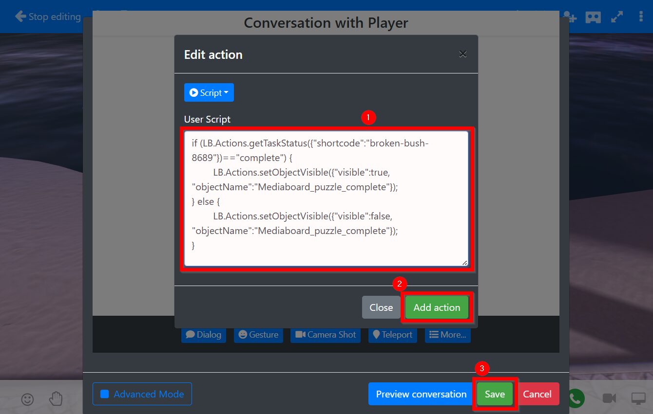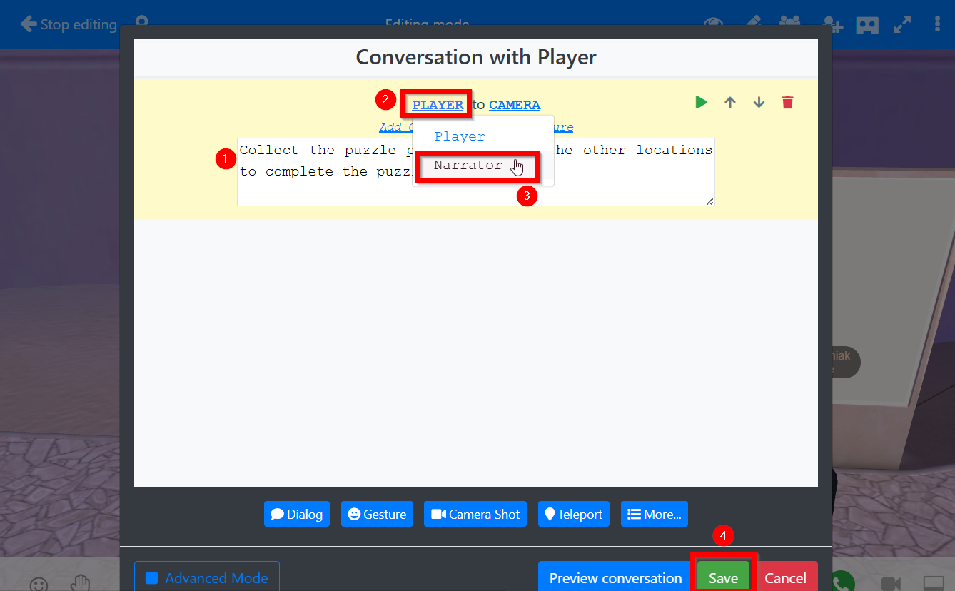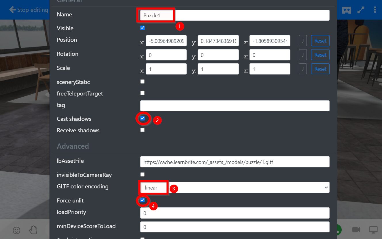 More puzzle pieces can be added by following these steps while updating the names of objects, collected Gamification items, and the 3D object URL (https://cache.learnbrite.com/_assets_/models/puzzle/2.gltf, …puzzle/3.gltf and so on)