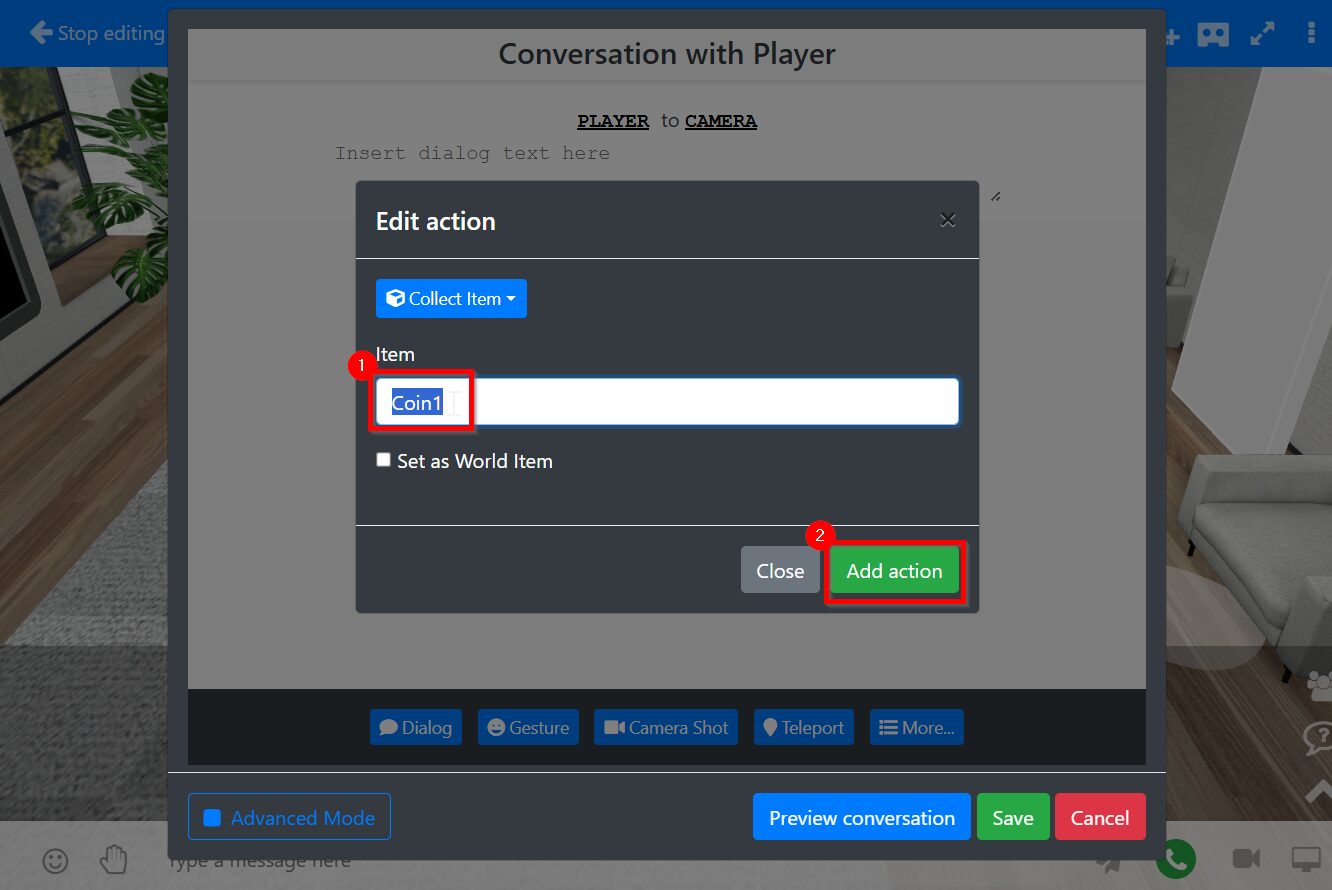 Click More button and select Collect item > Type Coin1 > Save action