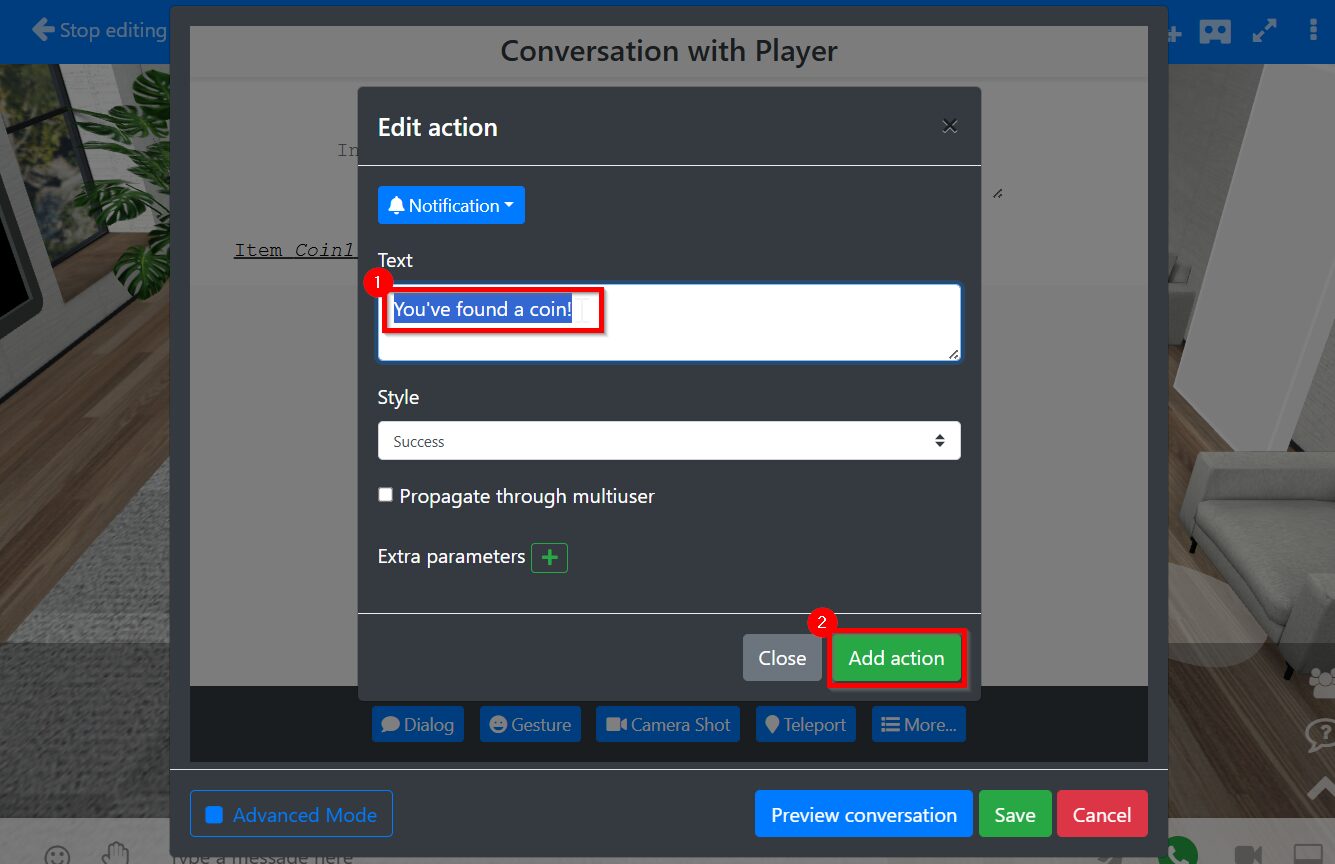 Click More button > select Notification > Type You've found a coin! > Style Success > Save action