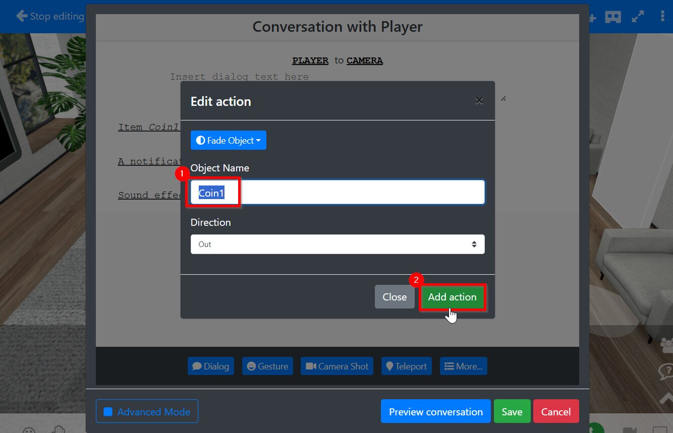 Click More button > select Fade object > select Coin1 item > Direction : out > Save action