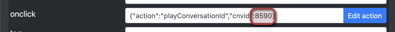 In the "onclick" field, click on the "Edit action" button. This will open the conversation editor for this object. Notice that the example is titled "Conversation with Player" and therefore it will also include actions related to the player (or user). From here, the steps detailed in the previous section can be followed.