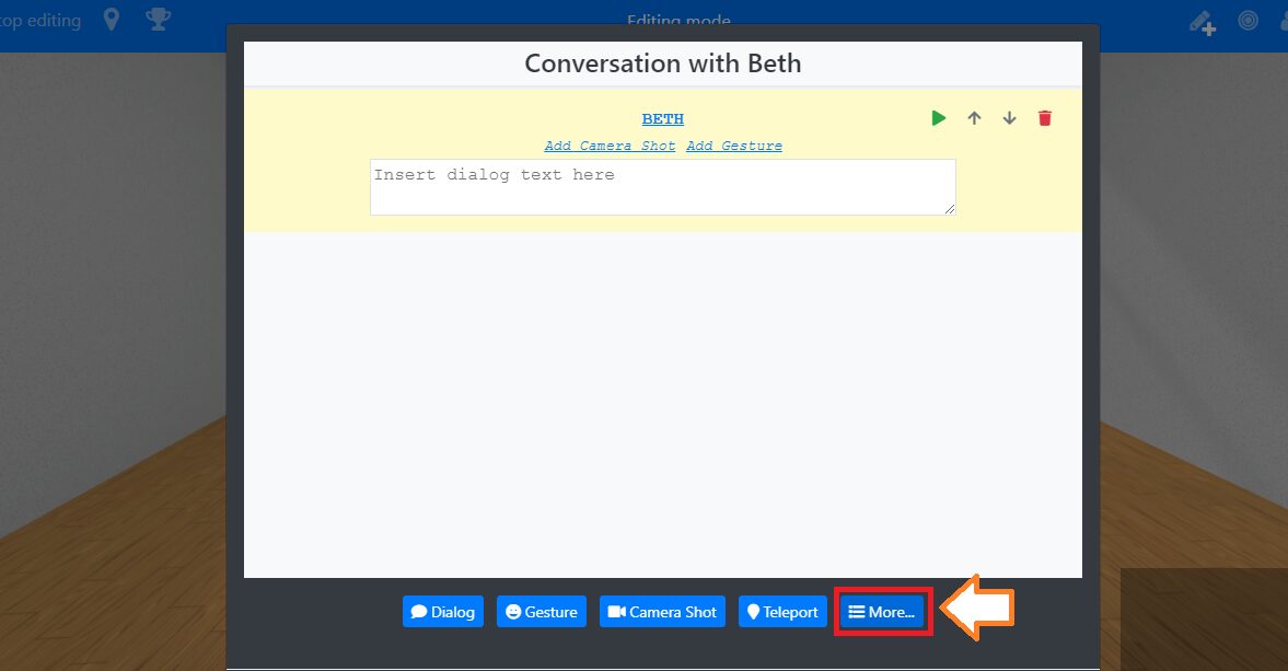 To add Trophio tasks, click on "More": the conversation editor will pop up. It is a script that allows speech and conversations to be added to bots in a space.