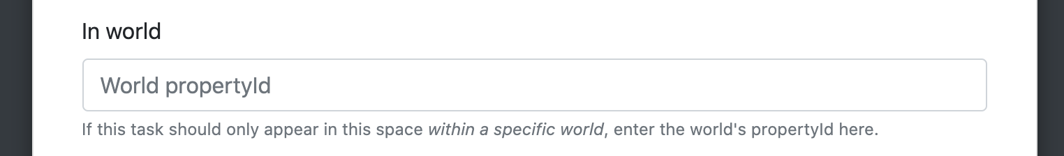 • In world: tasks can appear for a space, for a world, and also for a specific space within a world. To make a task only appear for the current space within a world, the worldId should be inserted in this field.
