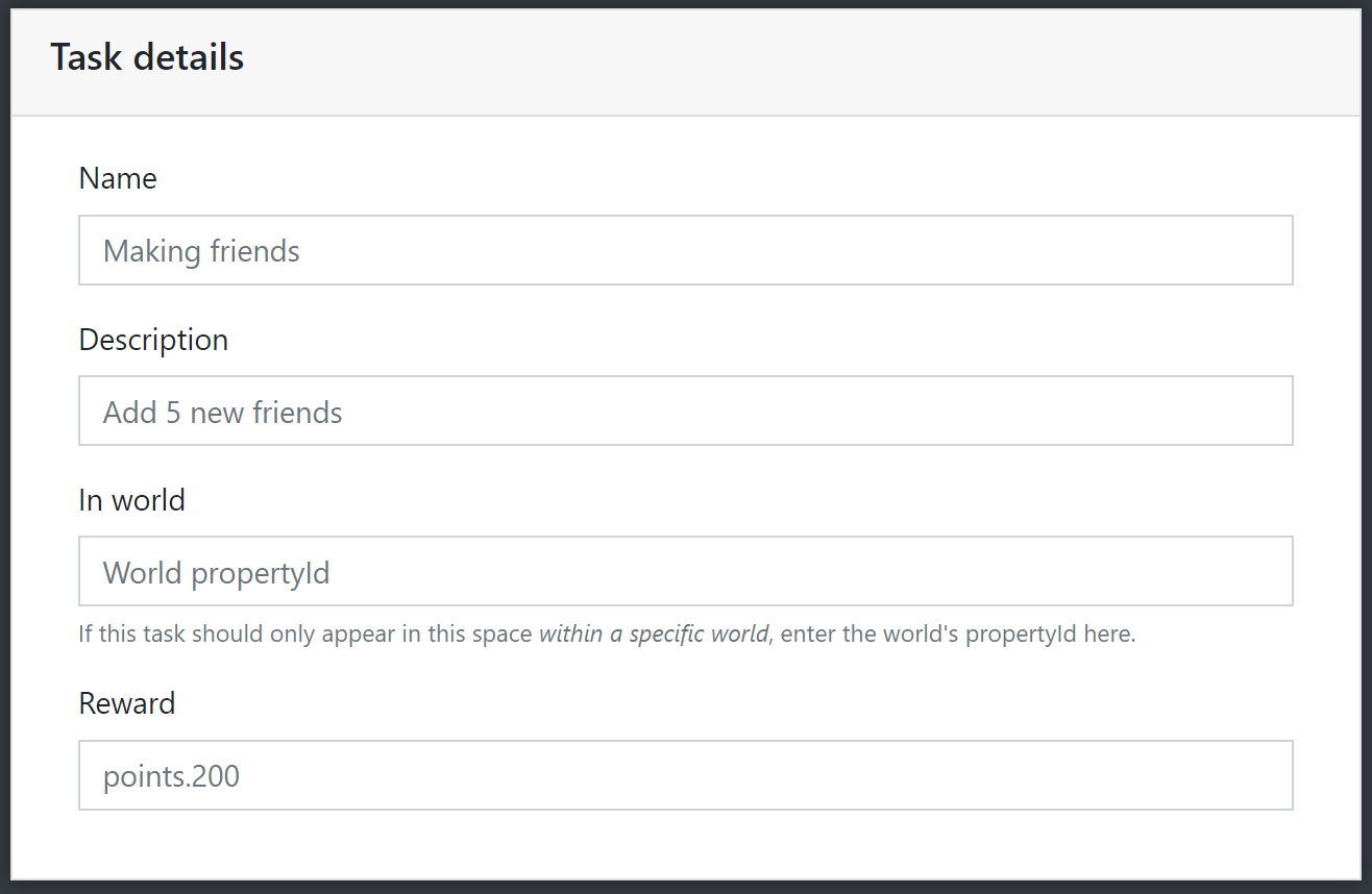 • Additional data: additional data for the task. Only a single option is currently available in this field, "global", which allows a task to be completed in any space within a world (see "How can I allow a user to complete a task in any space within a world?" in the FAQs section) {"global":true}